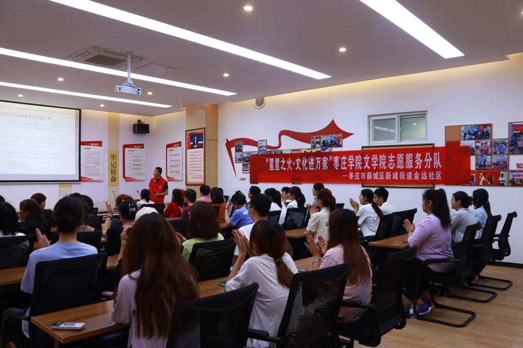 为深入开展学习贯彻习近平新时代中国特色社会主义思想主题教育,进一步响应团省委、省教育厅《关于开展“百万大学生进社区”社会实践的工作方案》部署要求,积极推进校地结对共建,bat365正版唯一官网团总支于6月13日,继续组织三十余名党、团员走进薛城区新城街道金远社区,开展“星星之火•文化进万家”社区实践活动,枣庄团市委副书记秦歌、青年发展部部长赵明皓莅临指导,金远社区团委书记闫馨月陪同。