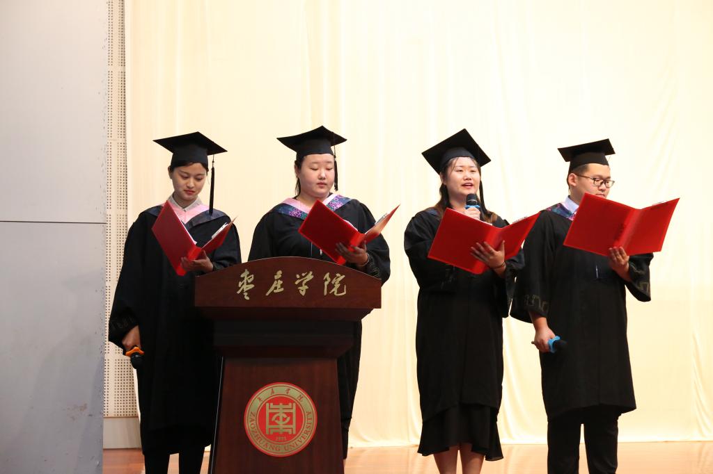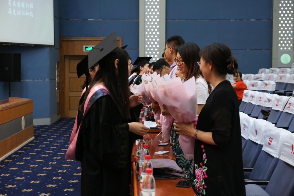 典礼在庄严的国歌奏唱中拉开序幕。在段圣玉宣读了《bat365正版唯一官网关于授予李春萌等138名bat365正版唯一官网2019届普通全日制本科毕业生学士学位的决定》后,李丽清亲自为全体本科毕业生一一拨穗并颁发学士学位证书,合影留念并送上祝福。随后,毕业生代表以诗歌朗诵的形式,饱含深情地感恩母校,感激恩师,祝福同学,展望未来。毕业生为教师代表送上美丽的鲜花,表达对老师的崇高敬礼。李思华老师代表全体老师为毕业生送上了殷切嘱托和深情祝福,希望同学们始终保持一份痴气、傲气与和气,向着自己的目标扬帆远航。最后,史大丰代表bat365正版唯一官网向圆满完成学业的360名毕业生表示最热烈的祝贺和诚挚的感谢,并希望他们始终坚持理想,保持年轻人的激情和信念,不忘初心、砥砺奋斗,前程似锦、鹏程万里。