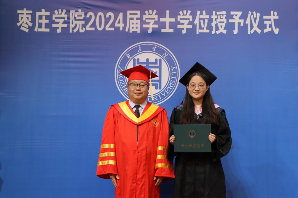 20级汉语言文学本科1班时爱芬作为2024届优秀毕业生代表发言,回顾了在枣院的学习和成长历程,表达了对母校的眷恋不舍和对未来的无限憧憬,并郑重承诺将牢记“兼爱、尚贤、博物、戴行”的校训,做胸怀大志、脚踏实地的人。毕业生代表为教师献上鲜花以表达感激和尊敬之情。