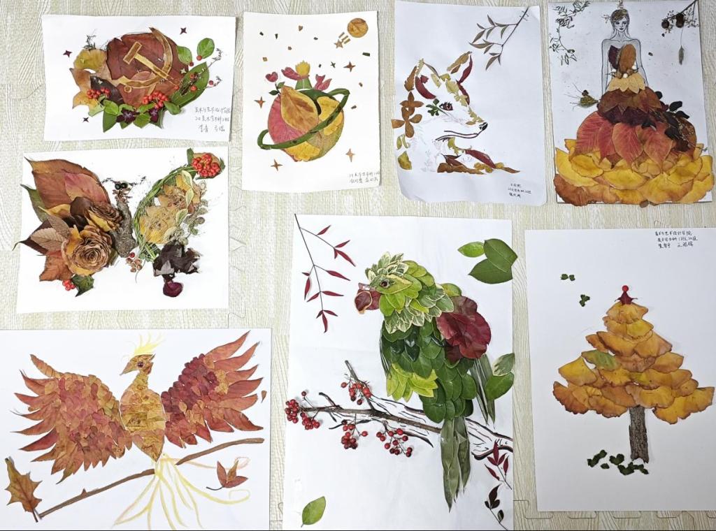 在活动室内,同学们以秋叶作为主要创作素材,在卡纸上自由地进行拼贴与绘画,创作出一系列充满秋日气息的艺术作品。这些作品中,有的展现了秋天的丰收与宁静,有的通过色彩的丰富渐变,捕捉了秋天自然界的诗意之美。还有同学通过将平面色彩与立体树叶手工相结合的方式,表达了自己对自然界的感悟,有的同学利用诗词、歌词、短句等元素作为创作灵感,拼接成流畅且充满诗意的作品。