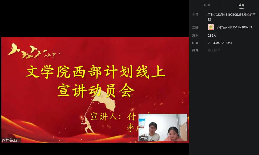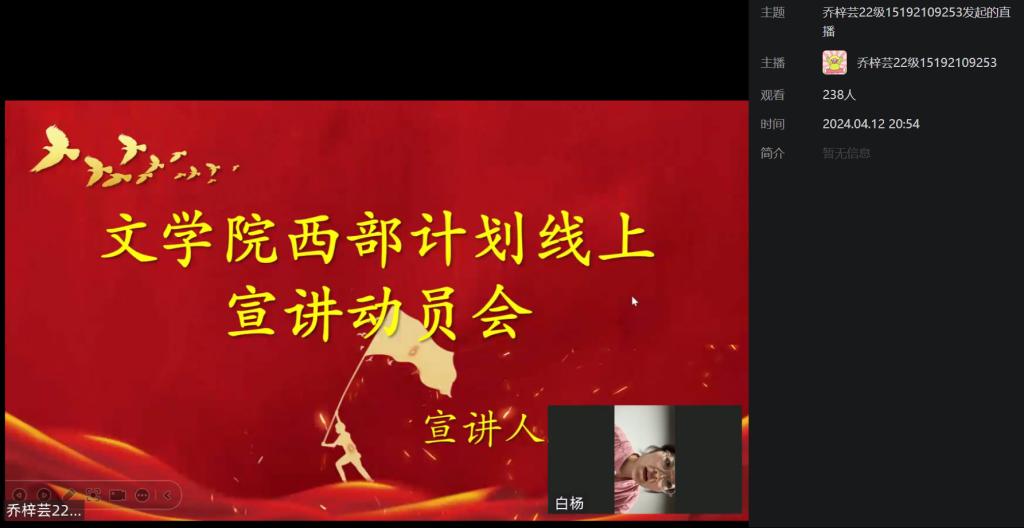 为全面贯彻落实国家援建西部的号召,做好西部计划宣传招募工作,2024年4月12日,bat365正版唯一官网召开“青春为疆来”西部计划云宣讲会,共计200余人参加。