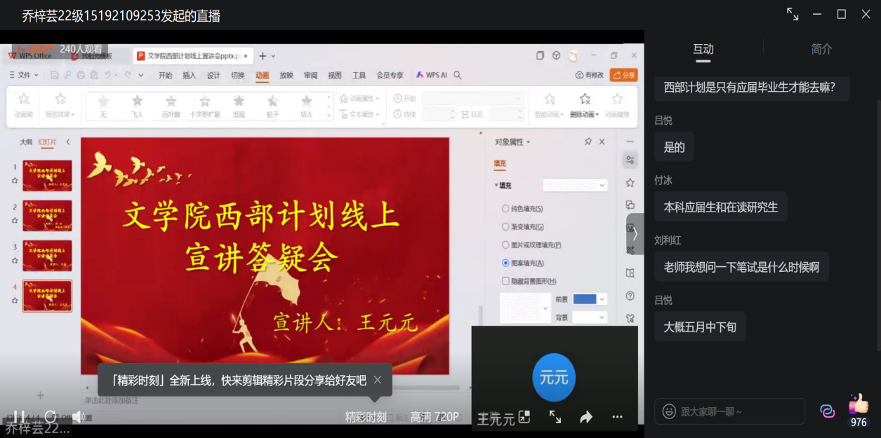 会议伊始,王元元老师简单地介绍了本次宣讲会的目的,普及了西部计划的主要项目、组织方法以及工作内容,从西部计划的基本情况、工作日常以及福利待遇等方面为同学们讲述参与西部计划的优势和意义,并提到了参与西部计划对同学们未来发展的积极影响,鼓励同学们踊跃报名参与。