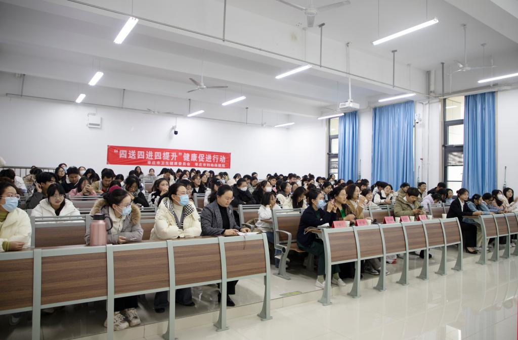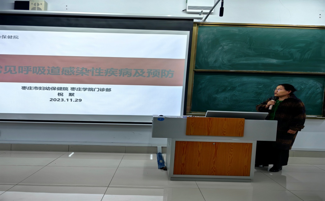 为预防和控制秋冬季节传染病的发生与流行,保护学生的身体健康,11月29日下午,bat365正版唯一官网联合枣庄市妇幼保健医院在增信楼3121教室举办开展秋冬季传染病预防知识讲座及义诊活动。市妇保院美容科主任张娜、全内科副主任医师祝默、中医科医师胡朝乾应邀出席,校医院副院长陶莉以及师生200人参加活动。