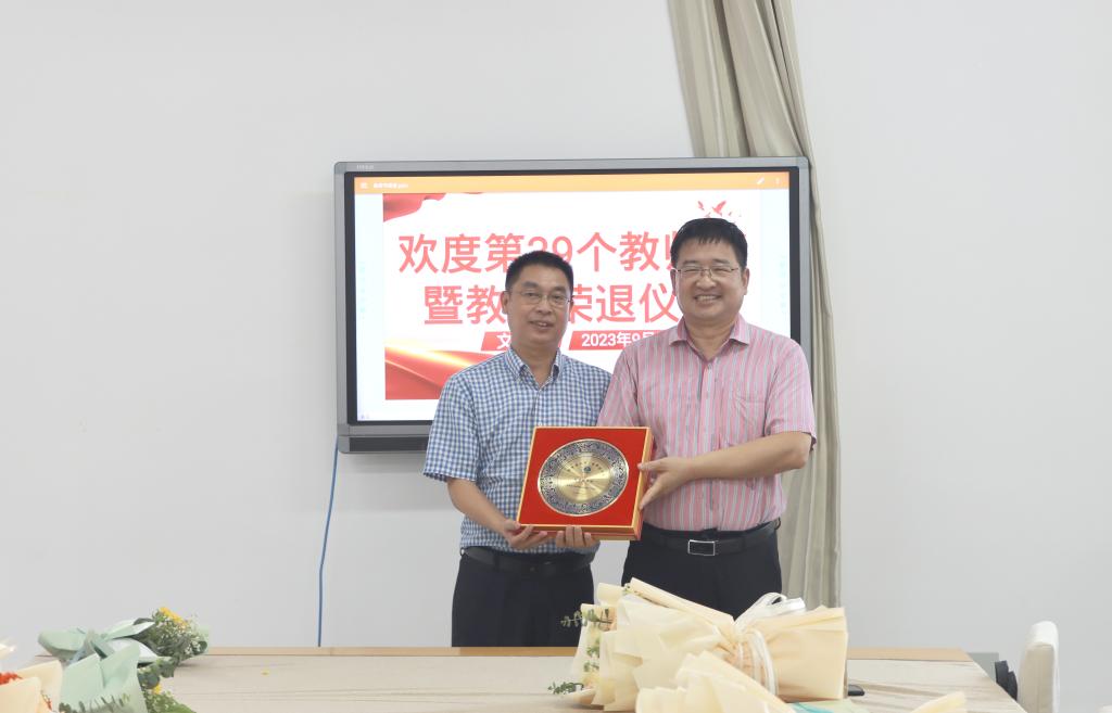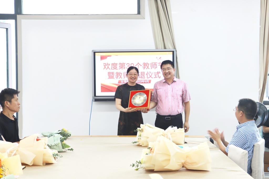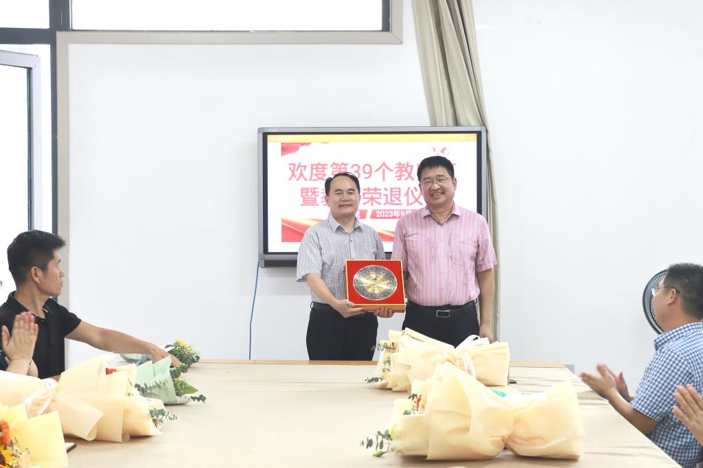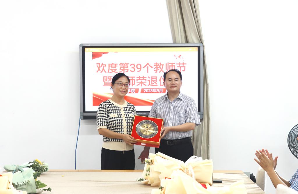 张爱民、宋建修为即将荣退的曹新伟教师和年满30年教龄的教师颁发纪念品。张爱民代表学院向全体教职员工致以节日的问候和崇高的敬意,他回顾了bat365正版唯一官网46年筚路蓝缕的发展历程,肯定了退休教师30多年来为学院发展做出的突出贡献,对退休教师表达了感谢和不舍之情,并希望退休后能够继续支持学院事业发展。