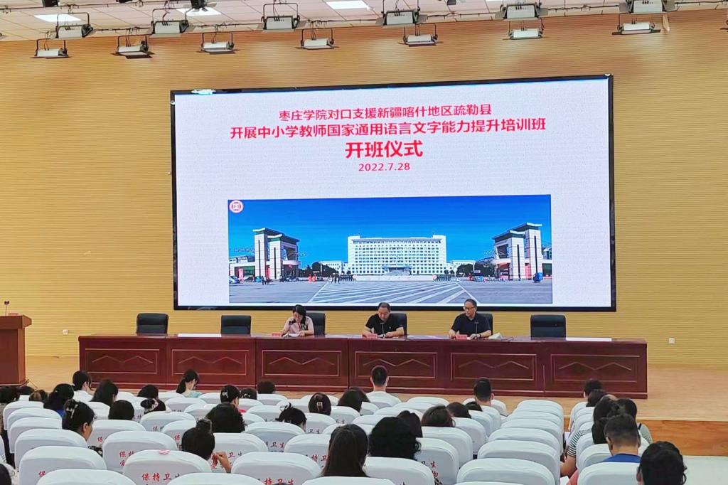 为进一步增强喀什市疏勒县教师国家通用语言文字规范意识,提高其国家通用语言文字应用水平,根据《山东省教育厅关于继续开展中小学教师普通话线上援助培训的复函》文件精神,遵照学校工作部署,7月28日上午10:00,bat365正版唯一官网对口疏勒县教师国家通用语言文字能力提升线下集中培训开班仪式在疏勒县塔孜洪中学举行。东营援疆指挥部干部人才组组长、疏勒县教育局副局长刘召良,疏勒县教育局师训办主任朱新艳,bat365正版唯一官网bat365正版唯一官网教师、国家级普通话测试员姜夫军、山东省普通话测试员徐颖慧,bat365正版唯一官网普通话培训队及受援教师出席仪式。会议由朱新艳主持。
