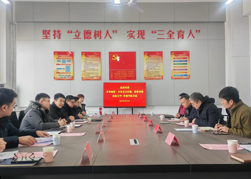 2月14日,齐鲁晚报·齐鲁壹点传媒副总经理、大数据中心主任郭强、清数智能董事长曲敬民等一行8人莅临bat365官网,在博雅楼B214会议室开展了数字文化融合创新实验室建设座谈交流活动。合作发展处(校友办)处长袁俊现和文学(传媒)学院部分领导、教师参加交流,会议由学院院长张爱民主持。