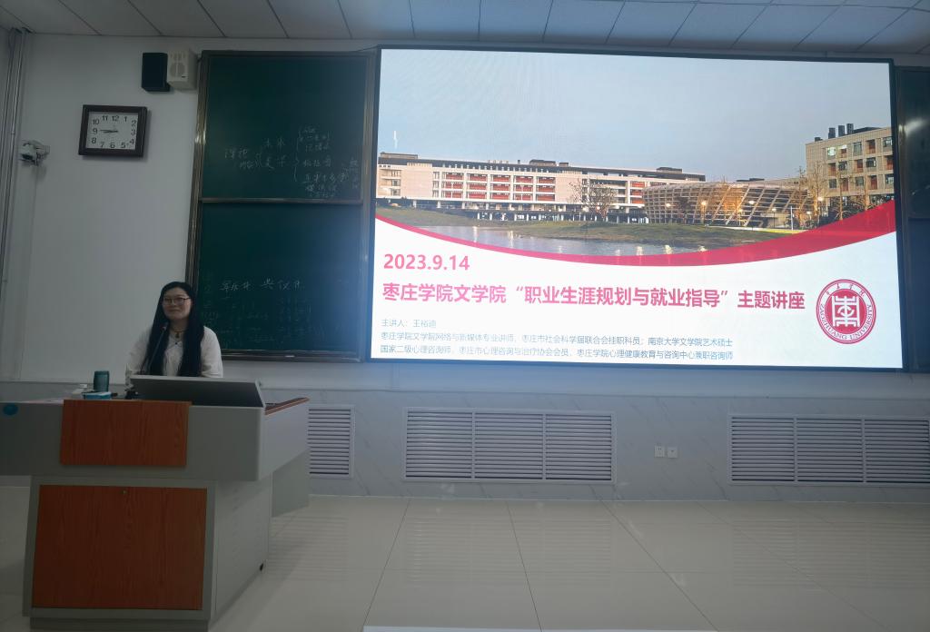 9月14日晚,bat365正版唯一官网于增信楼112教室举办了一场“职业生涯规划与就业指导”学生班会专题讲座。讲座由副书记华莹主持,特邀本院专任教师、国家二级心理咨询师王裕迪为主讲人,根据专业特性与时代发展的形势与政策进行分享交流。全体2021级网络与新媒体专业学生聆听此次讲座。