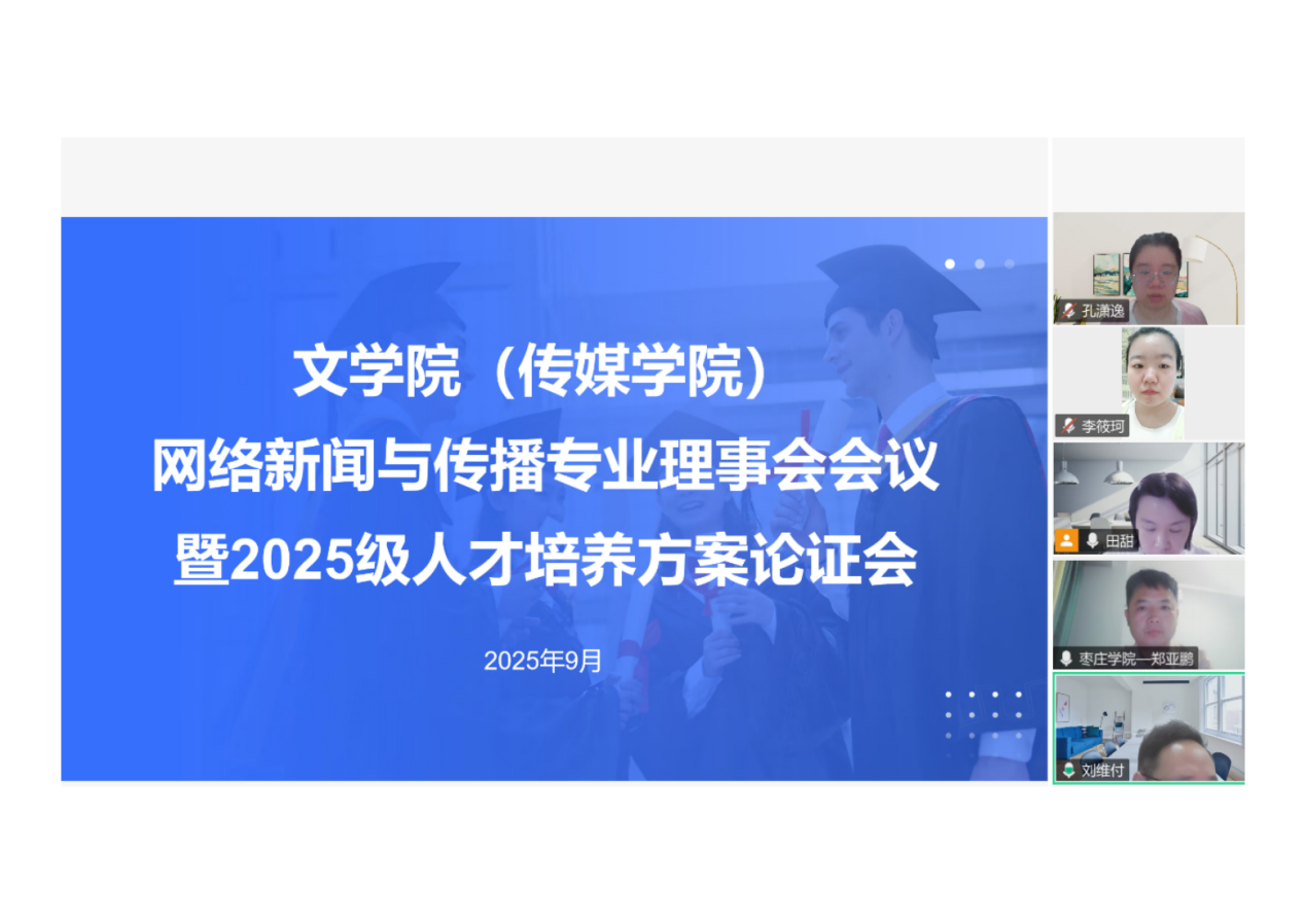 9月3日,bat365正版唯一官网(传媒学院)网络与新媒体、网络新闻与传播专业召开专业理事会会议暨2025级人才培养方案论证会。西安财经大学bat365正版唯一官网新闻传播系系主任刘维付、bat365正版唯一官网bat365正版唯一官网(传媒学院)副院长郑亚鹏、网络与新媒体教研室主任孔潇逸及教师代表李筱珂参加会议。会议由网络与新媒体专业负责人田甜主持。