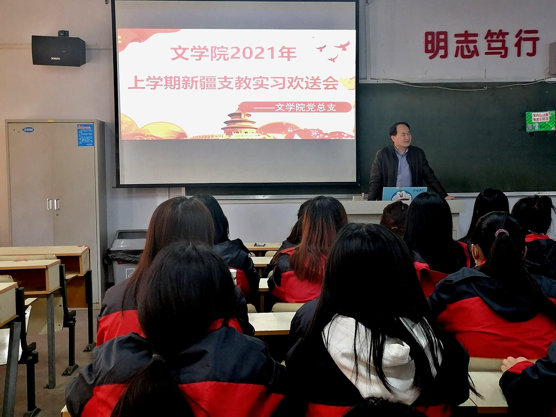 会上,杨全顺对即将赴疆支教的同学们寄托了自己美好的祝愿,希望同学们能够不忘初心,为民族和谐团结、地方教育事业做出属于自己的贡献。同时,分享了自己的支教经历,从民族风情、教学工作、生活环境、衣食住行等方方面面为同学们提供指导与建议。